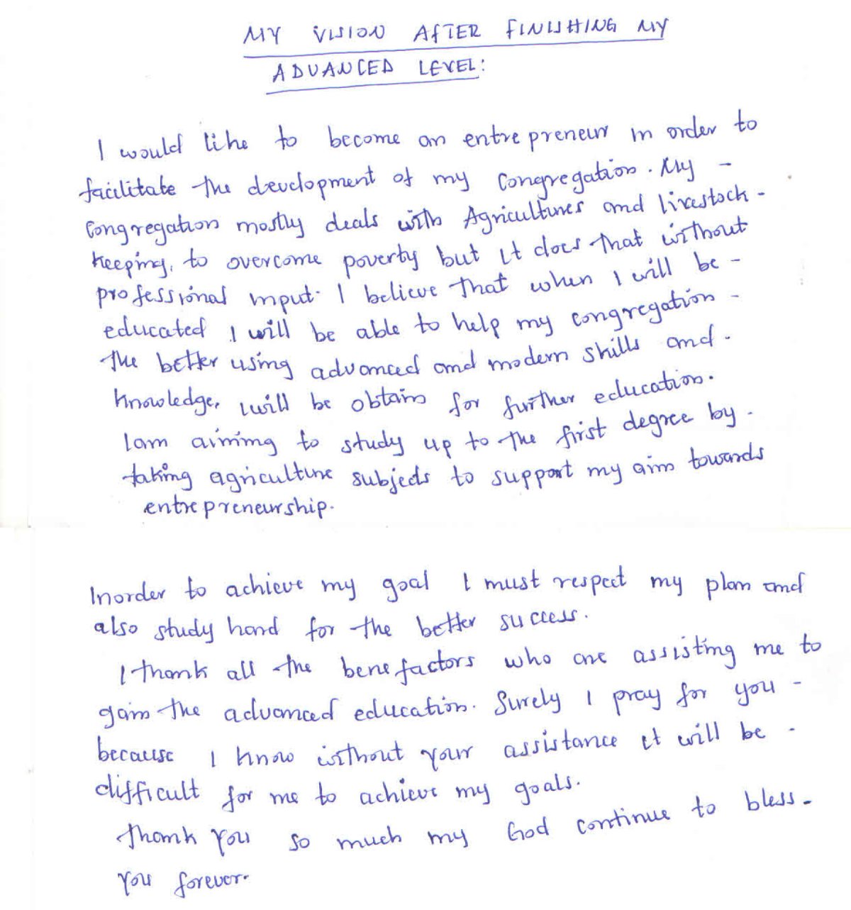 I would like to become an entrepreneur in order to facilitate the development of my congregation. My congregation mostly deals with agricultures and livestock keeping to overcome poverty but it does that without professional input. I believe that when I will be educated I will be able to help my congregation the better using advanced and modern skills and knowledge, I will be obtain for further education. I am aiming to study up to the first degree by taking agriculture subjects to support my aim towards entrepreneurship.