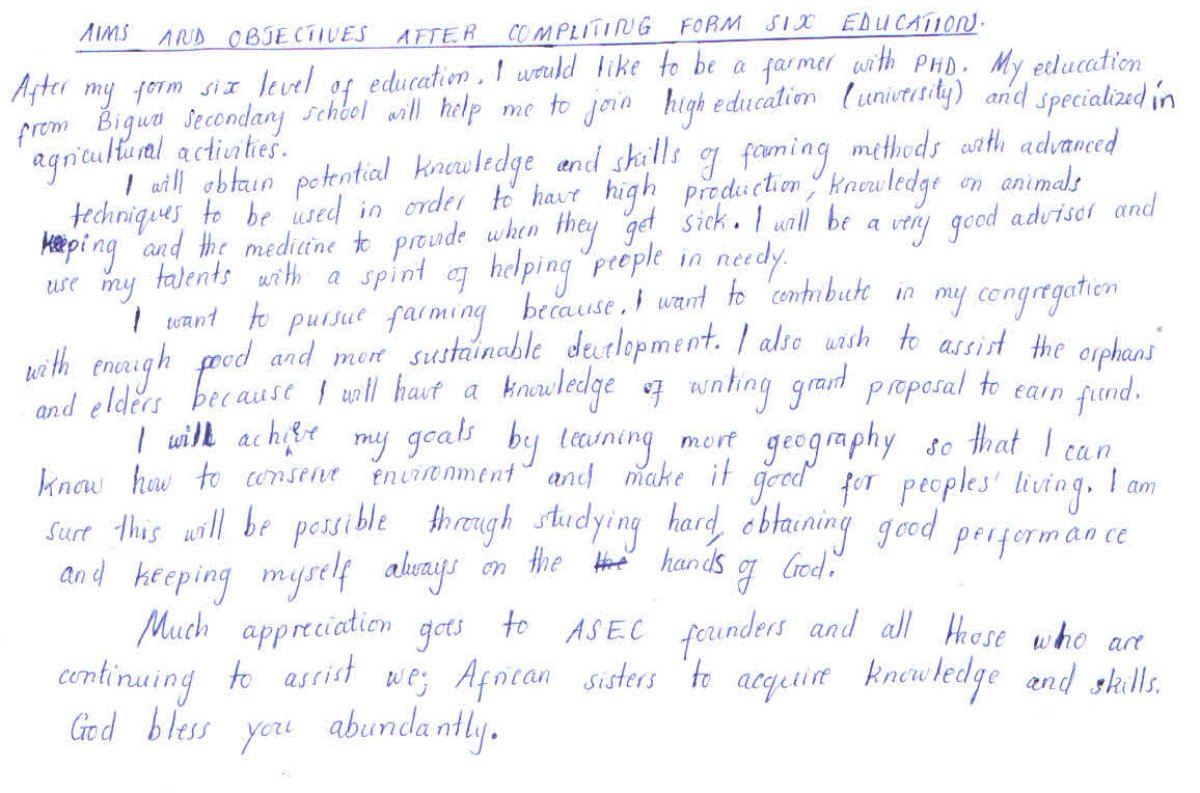 Much appreciate goes to ASEC founders and all those who are continuing to assist we; African sisters to acquire knowledge and skills. God bless you abundantly.